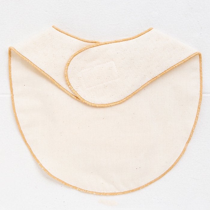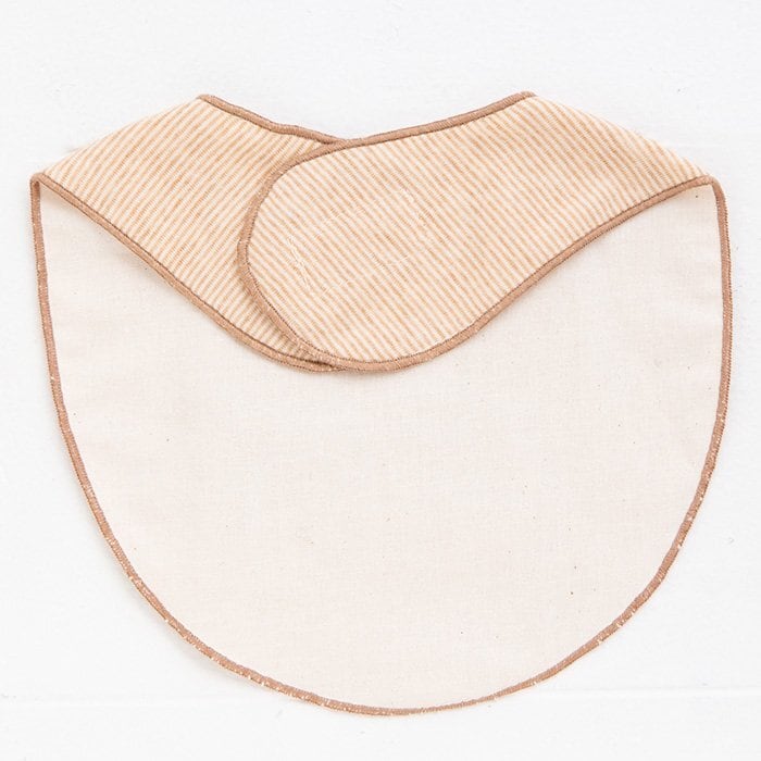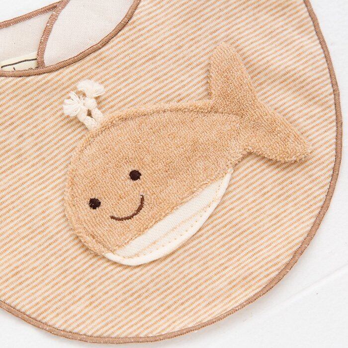普段使いに便利な小さめスタイです。ナチュラルはやさしい透かし柄のフライス、ブラウンには細ボーダーの天竺をベースに、半立体のくじらモチーフが付いています。うしろについているマジックテープで、首廻りの調節も出来ます。