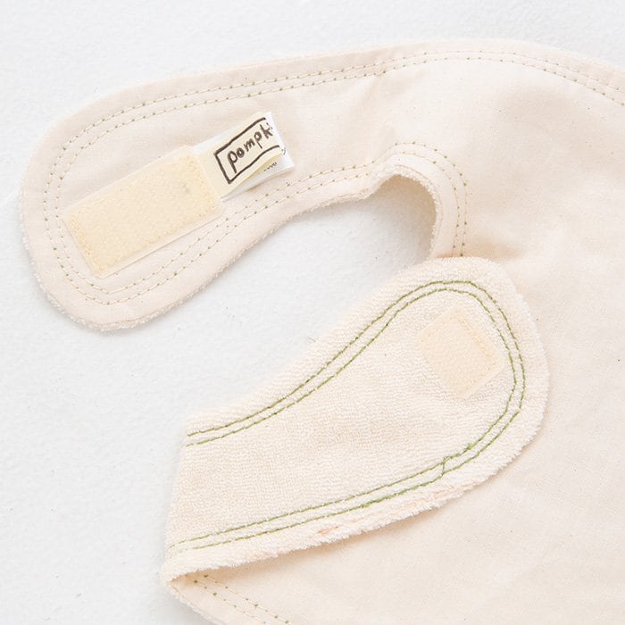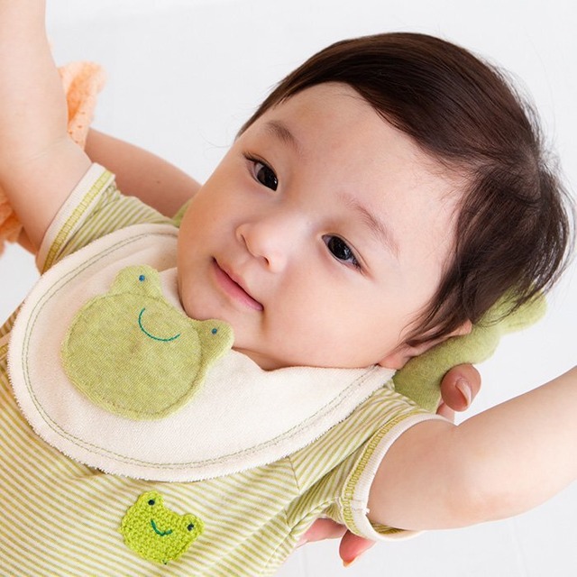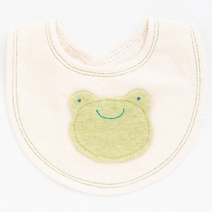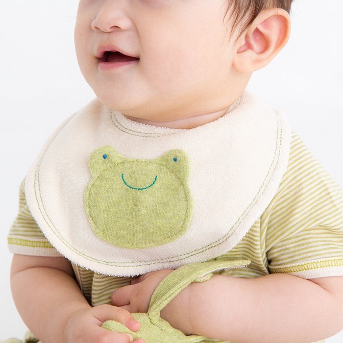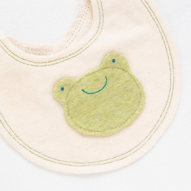 普段使いに便利な小さめスタイです。半立体のかえるモチーフが可愛いパイル素材のミニスタイです。うしろのマジックテープで首まわりの調節ができます。