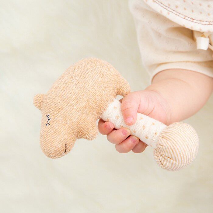 すやすやと気持ち良さそうに眠っているカピバラのスティックガラガラ。赤ちゃんでもにぎりやすい太さです。