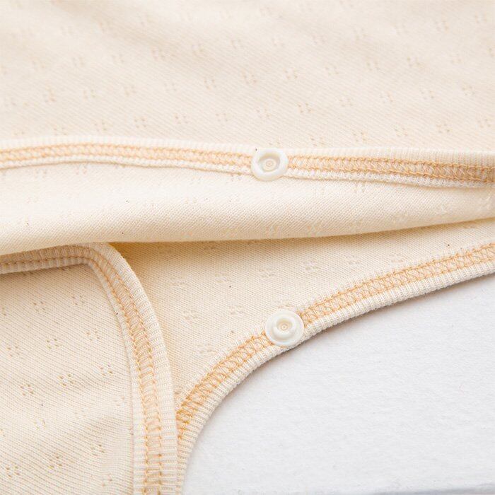 赤ちゃんの足の広がりに合う裾広がりのデザイン。元気に足を動かしてもはだけない股下リングスナップつき。お腹が冷えにくく体のサイズに合わせやすい打ち合わせ。ヒモもオーガニックコットン100%。ネームは肌に当たらない場所に付いています。