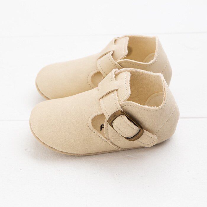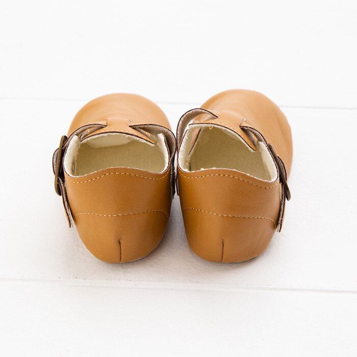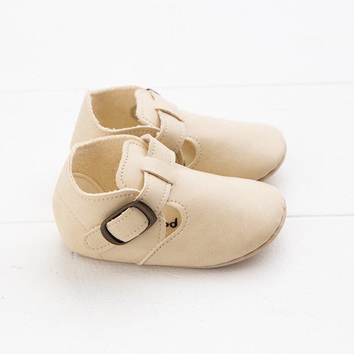 合皮の中でも風合いのよいシフォンカーフを使い、裏にはパイルだけを貼って柔らかく仕上げました。合皮にありがちな固さは全くなく、赤ちゃんの足を包み込みます。アンティークゴールドの金具を使い、大人っぽいデザインながらも、赤ちゃんにやさしいシューズです。